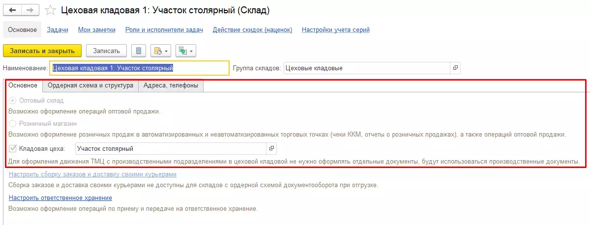 Склад может относиться к разным типам в зависимости от характера использования: Розничный магазин, Оптовый склад или Цеховая кладовая. Каждый тип подразумевает выбор соответствующих параметров в карточке склада.
