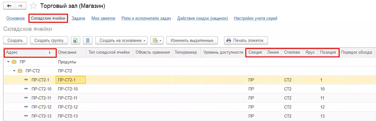 Складская ячейка имеет индивидуальный адрес местоположения на складе или в помещении. Адрес упорядочен и содержит структурные элементы: секция, линия, стеллаж, ярус, место на полке.