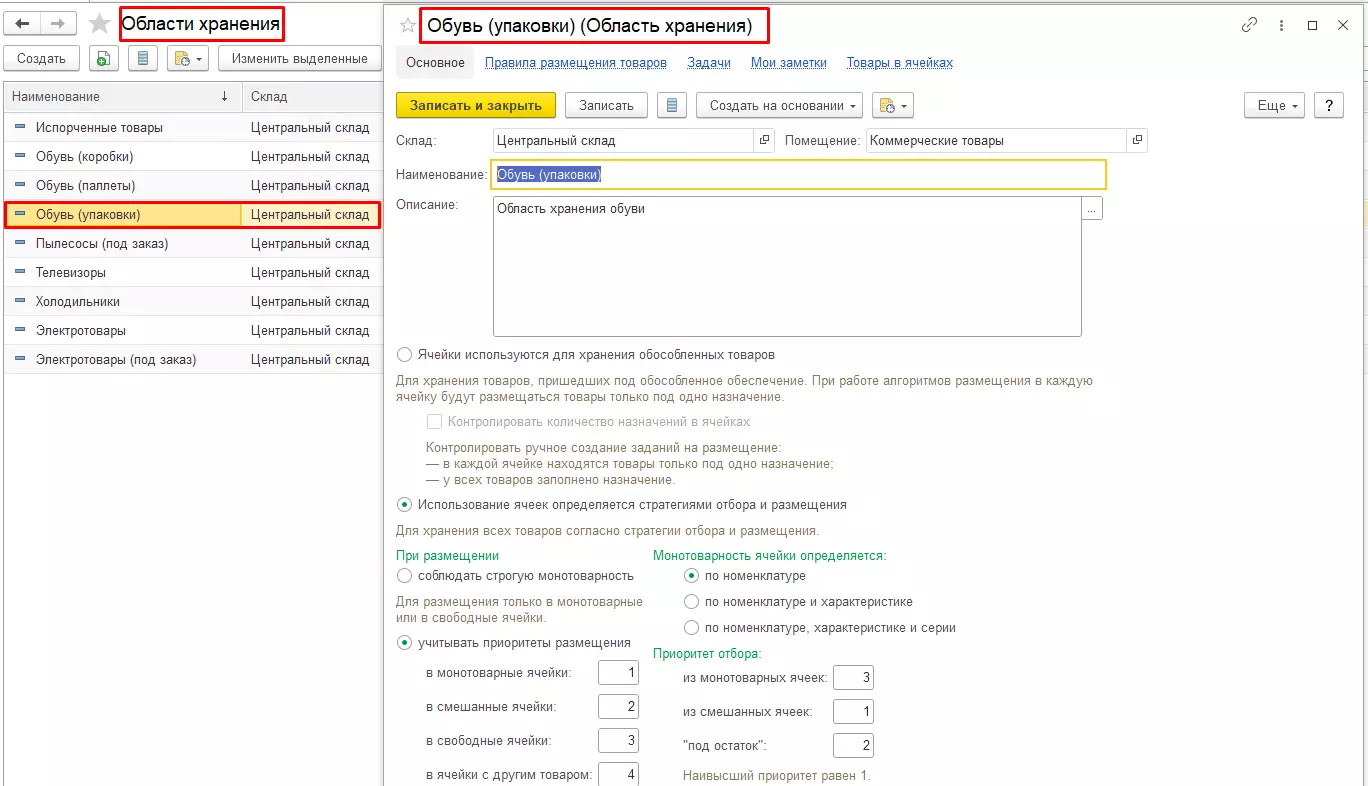 За возможность деления складского пространства на зоны с разными технологиями работы (вручную, с помощью устройств, со специальным оборудованием) отвечают Рабочие участки, а за сегментирование склада по условиям хранения – Области хранения.