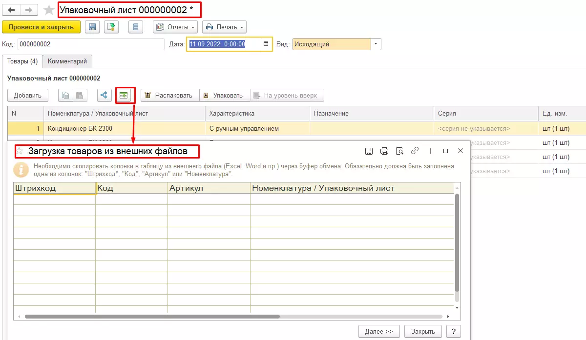 В программе 1С:Комплексная автоматизация 2.5 предусмотрена приемка товара на склад по упаковочным листам. Заполнить номенклатуру в документе «Упаковочный лист» можно как вручную, так и посредством загрузки из Excel.
