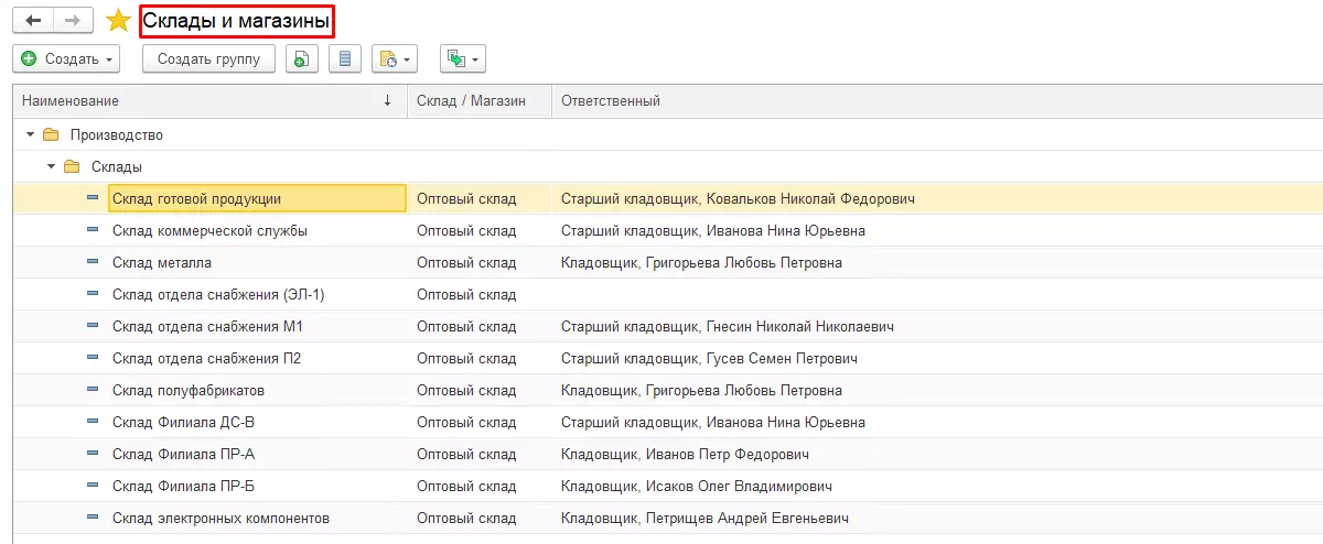 Далее нужно создать в 1С КА иерархический список складов. Для этого заполните справочник «Склады и магазины» с группами и требуемыми критериями (например, местонахождение, профиль) в разделе НСИ и администрирование – НСИ – Склады и магазины.