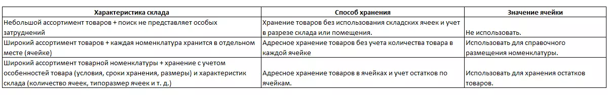 Для предотвращения ошибок складирования и увеличения скорости поиска нужного наименования рекомендуется все товары помещать в ячейки с «адресами» (кодами).