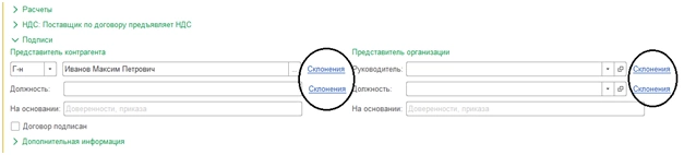 Рассмотрим функцию склонения на примере договора в «1С:Бухгалтерия» 3.0. (1С:Предприятие 8.3). Здесь предусмотрено склонение ФИО и должности.