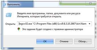 Для склонения ФИО в программах 1С предусмотрена внешняя компонента – NameDecl.dll, в которой содержится функция склонения. Ее можно взять на диске ИТС и, скопировав в папку с установленной платформой 1С – bin, зарегистрировать ее в операционной системе. Выполняется данная процедура при помощи команды resvr32 NameDecl.dll (под учетной записью администратора). Для этого необходимо вызвать команду «Выполнить» через кнопку «Пуск», воспользовавшись поиском или сочетание клавиш Windows + R.