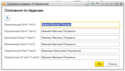 В программах 1С 8.3 уже включен сервис для склонения данных сотрудников или контрагентов в соответствии с применяемыми в документе падежами.