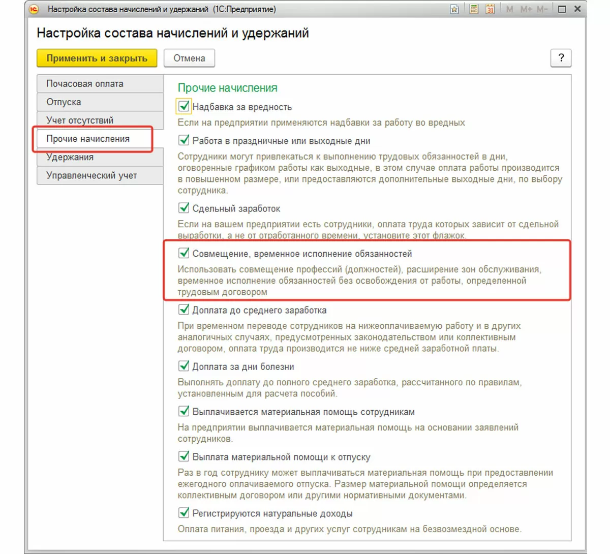 В разделе «Настройка» выбираем «Расчет зарплаты». В окне «Настройка состава начислений и удержаний» на вкладке «Прочие начисления» необходимо установить галочку на «Совмещение, временное исполнение обязанностей».
