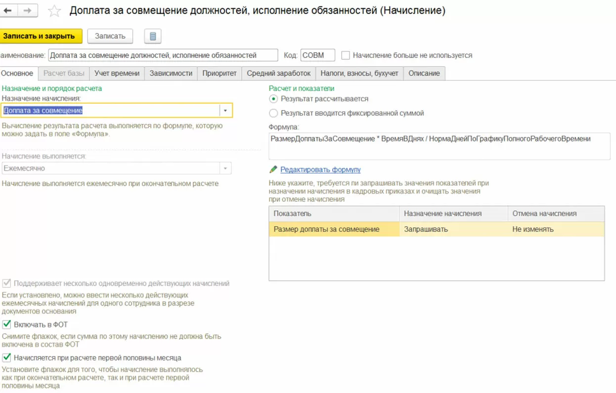 При необходимости можно создать собственное начисление с назначением «Доплата за совмещение», в закладке «Основное» описав произвольную формулу с использованием показателя «Размер доплаты за совмещение» (например, Размер доплаты за совмещение, умноженное на Время в днях и поделенное на Норму дней по графику полного рабочего времени). Для этого достаточно позвонить нашим специалистам и мы настроим нетиповые начисления в 1С:ЗУП за совмещение должностей.