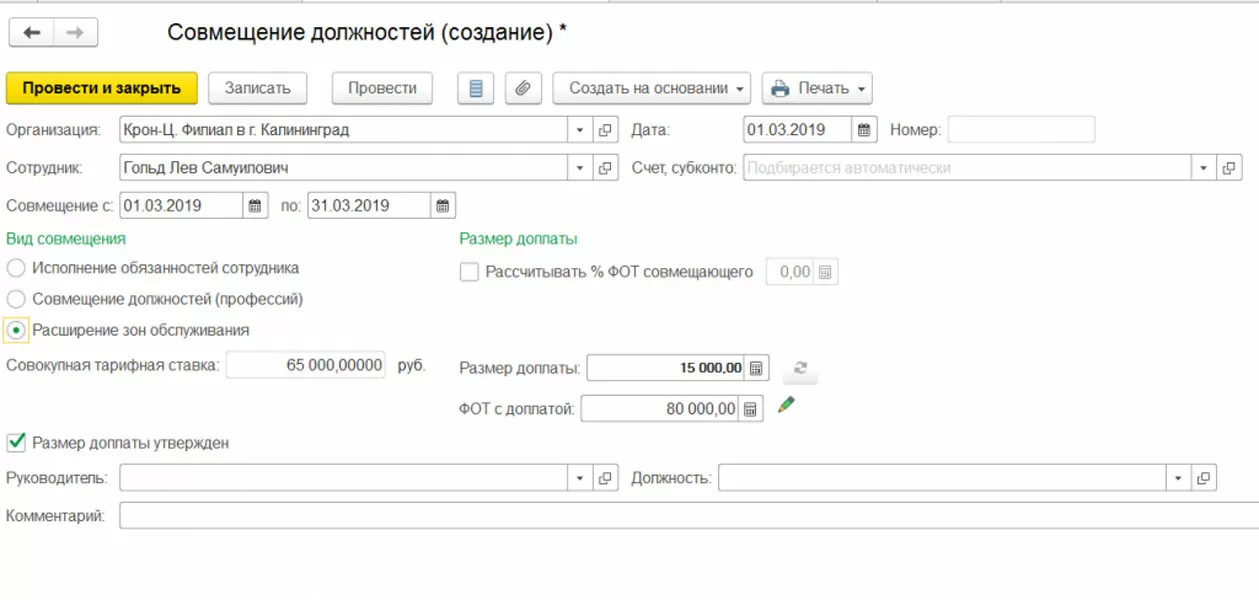 - Номер: не активно. Автоматическое присвоение номера документу произойдет после его записи. Он также используется в печатной форме приказа на совмещение.