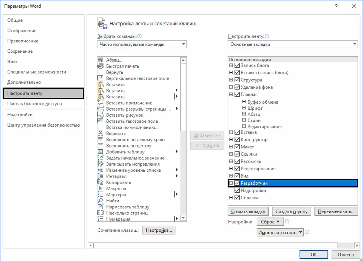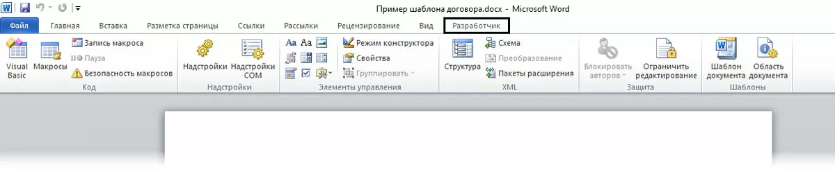 В результате в меню появляется дополнительная одноименная вкладка «Разработчик».