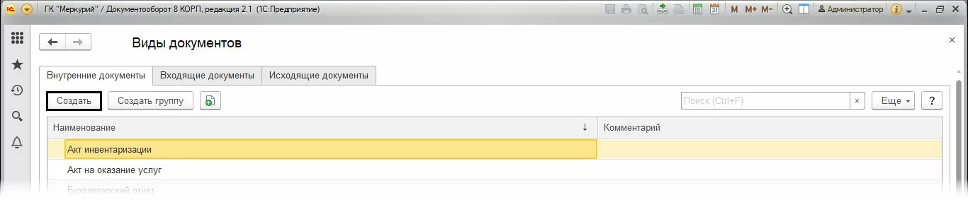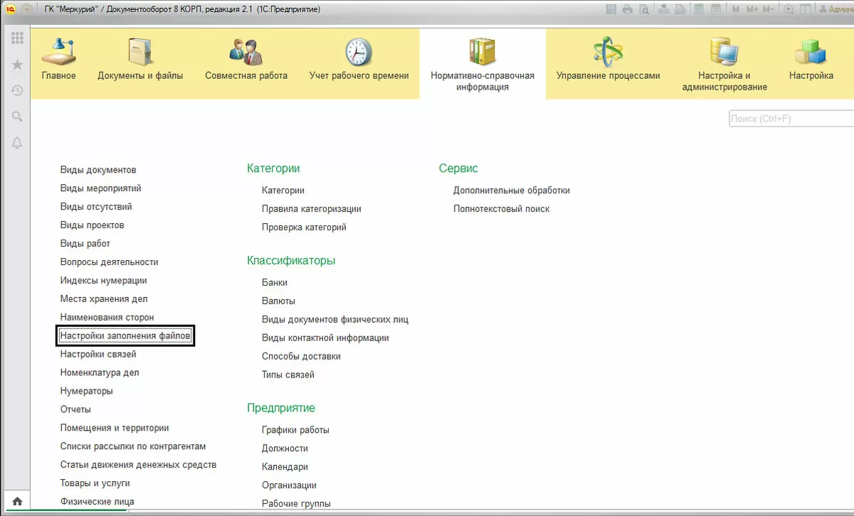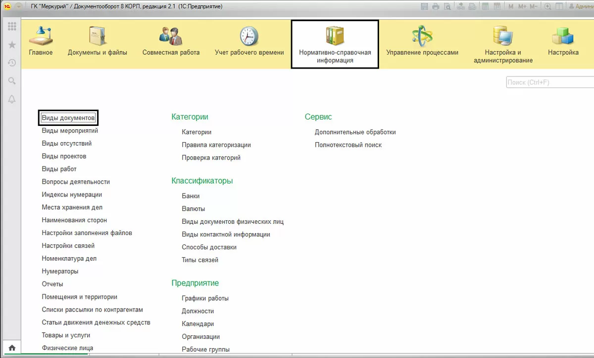 Далее, для примера, создадим новый вид документа, который будет заполняться из шаблона. Откроем раздел «Нормативно-справочная информация» - «Виды документов».