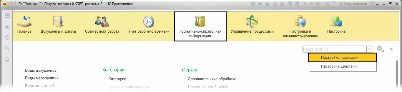 Для дальнейшей настройки перейдем в раздел «Нормативно-справочная информация». В кнопке настройка выберем пункт «Настройка навигации». В нем мы можем вывести на рабочий стол пункты меню, которых нет на рабочем столе.