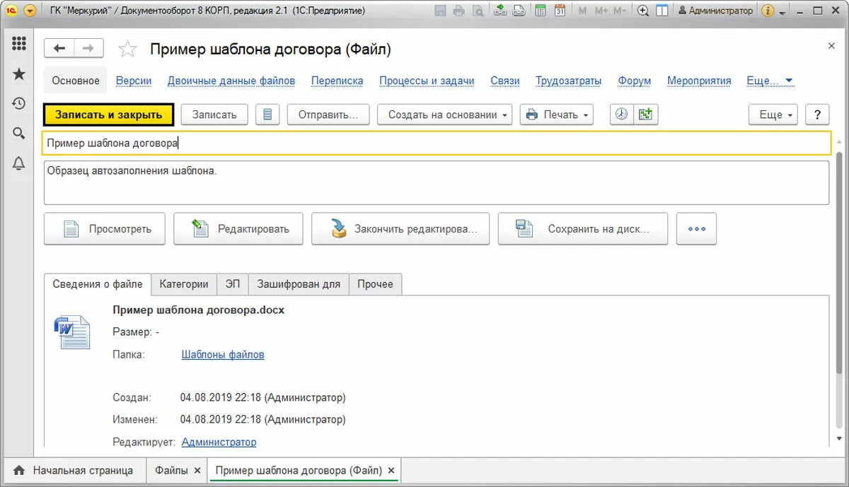 Совершив все эти действия, мы настроили систему так, чтобы реквизиты заполнялись автоматически при создании документа. Работа с шаблонами документов повышает эффективность работы пользователей, сокращая время создания новых документов. Использование шаблонов позволяет избежать ошибки заполнения документов и создавать документы в едином стиле.