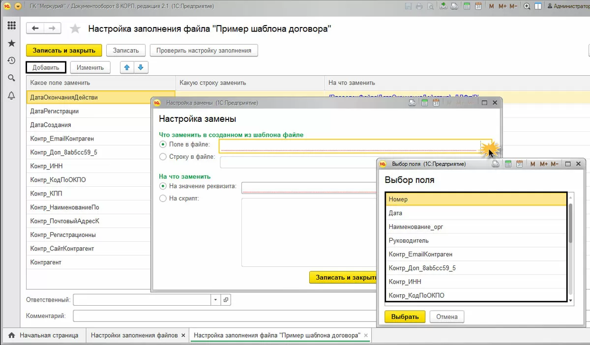 В разделе «Настройка заполнения файлов» выполним настройку заполнения нашего шаблона. Для этого с помощью кнопки «Добавить» выполняем настройку замены, указав введенные поля из созданного нами шаблона.