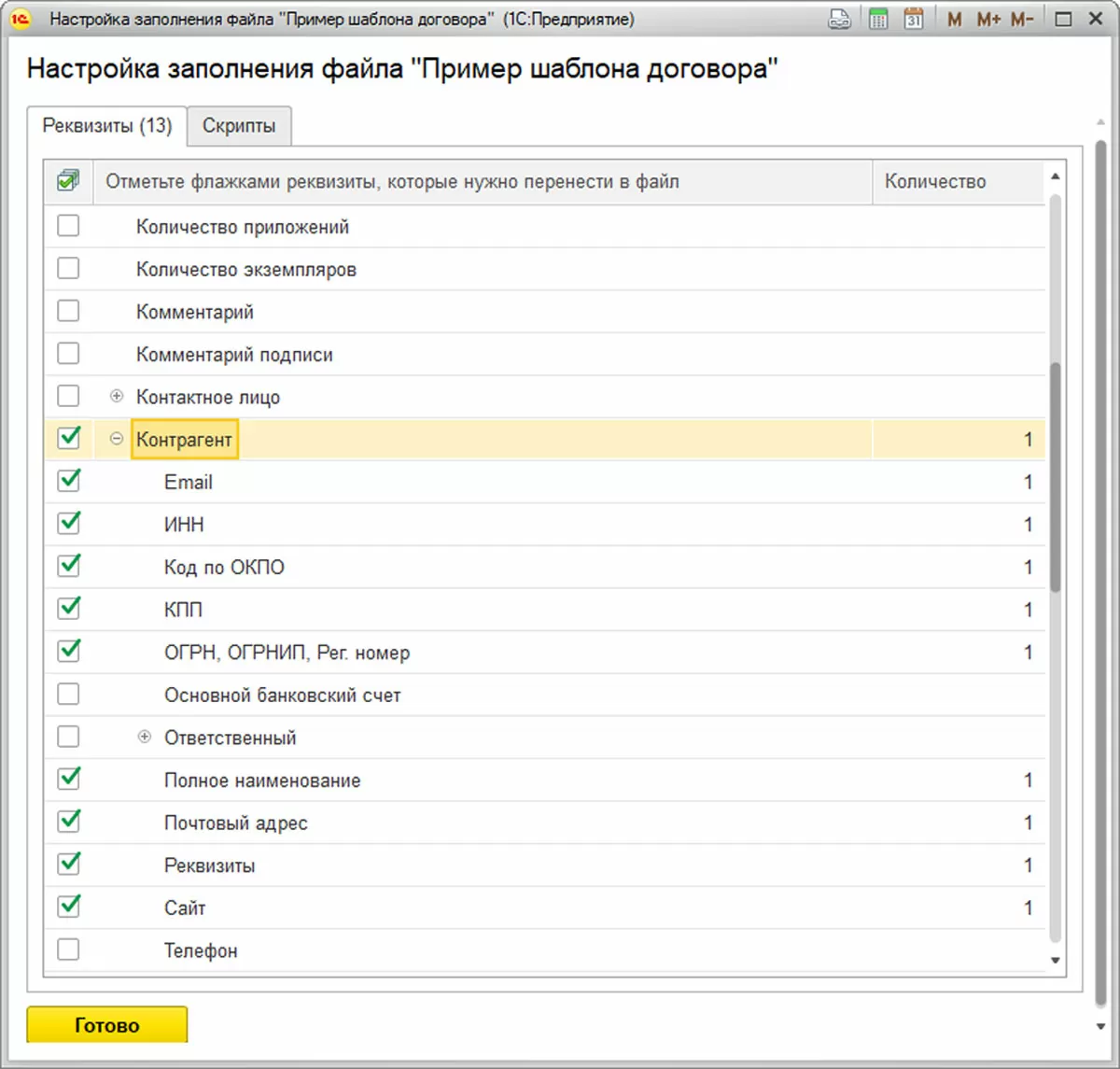 В открывшемся окне отметим галочками реквизиты и их количество. В шаблоне мы можем эти реквизиты вставлять в нужные места текста (используя команды «Копировать», «Вставить»).