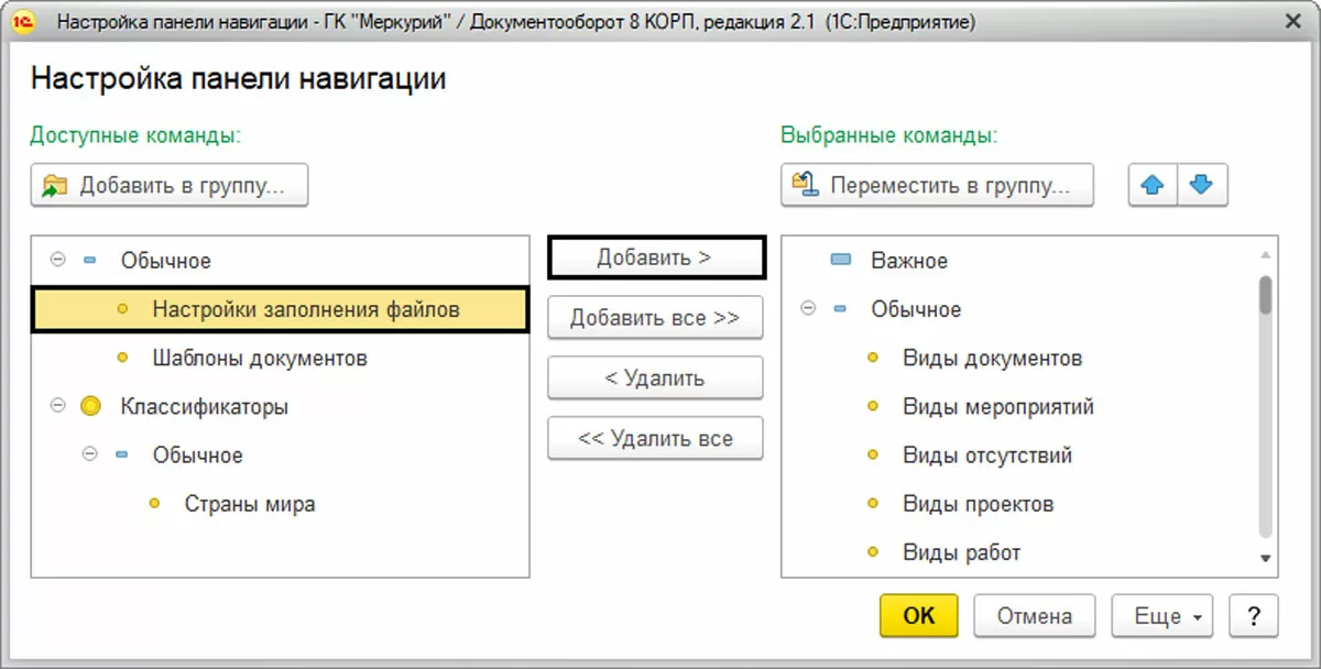 Перенесем с помощью кнопки «Добавить» пункт «Настройки заполнения файлов» в правую часть окна «Выбранные команды».