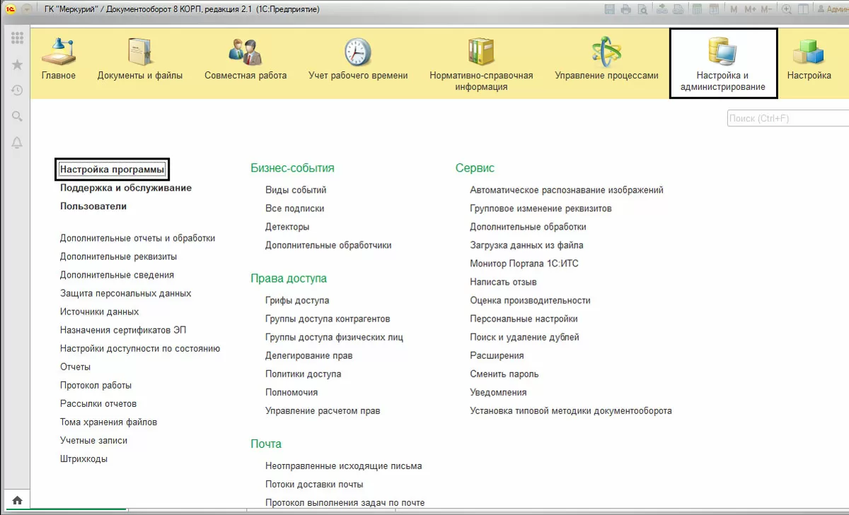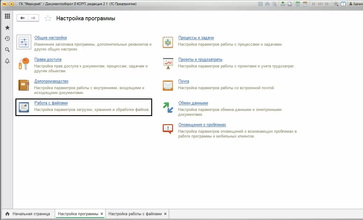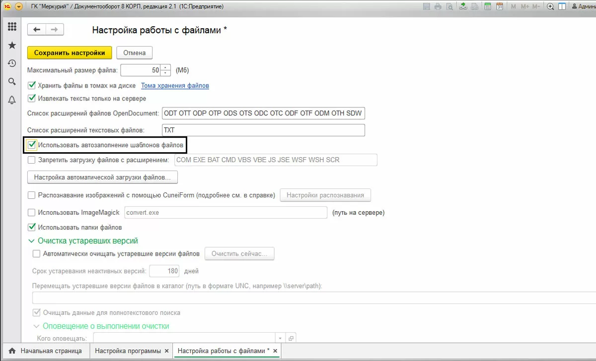 Чтобы программа имела возможность работать с автозаполняемыми шаблонами, нужна соответствующая настройка шаблонов. Перейдем по пути «Настройка и администрирование-Настройка программы-Работа с файлами».