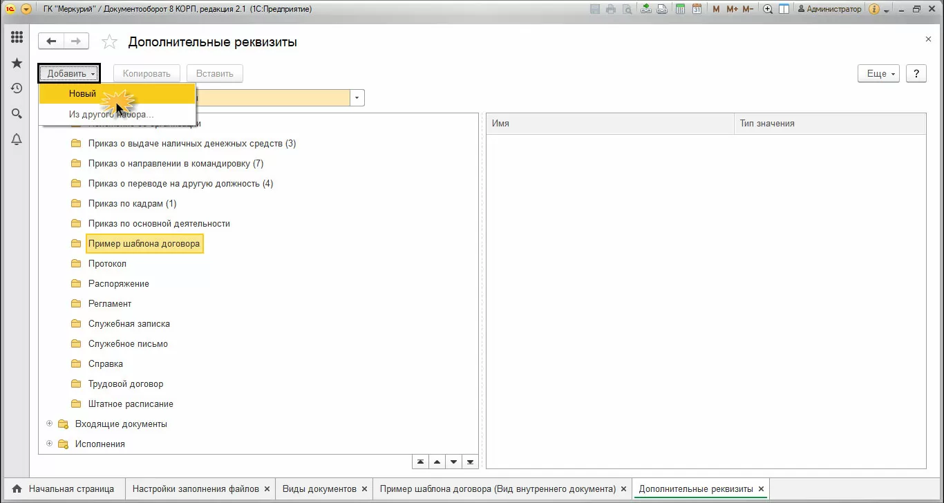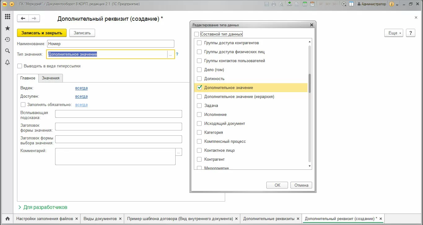 При создании нового реквизита указывается его наименование и задается тип значения из предложенного списка. Если тип значения задан как «Дополнительное значение», то их список можно задать на закладке «Значения».