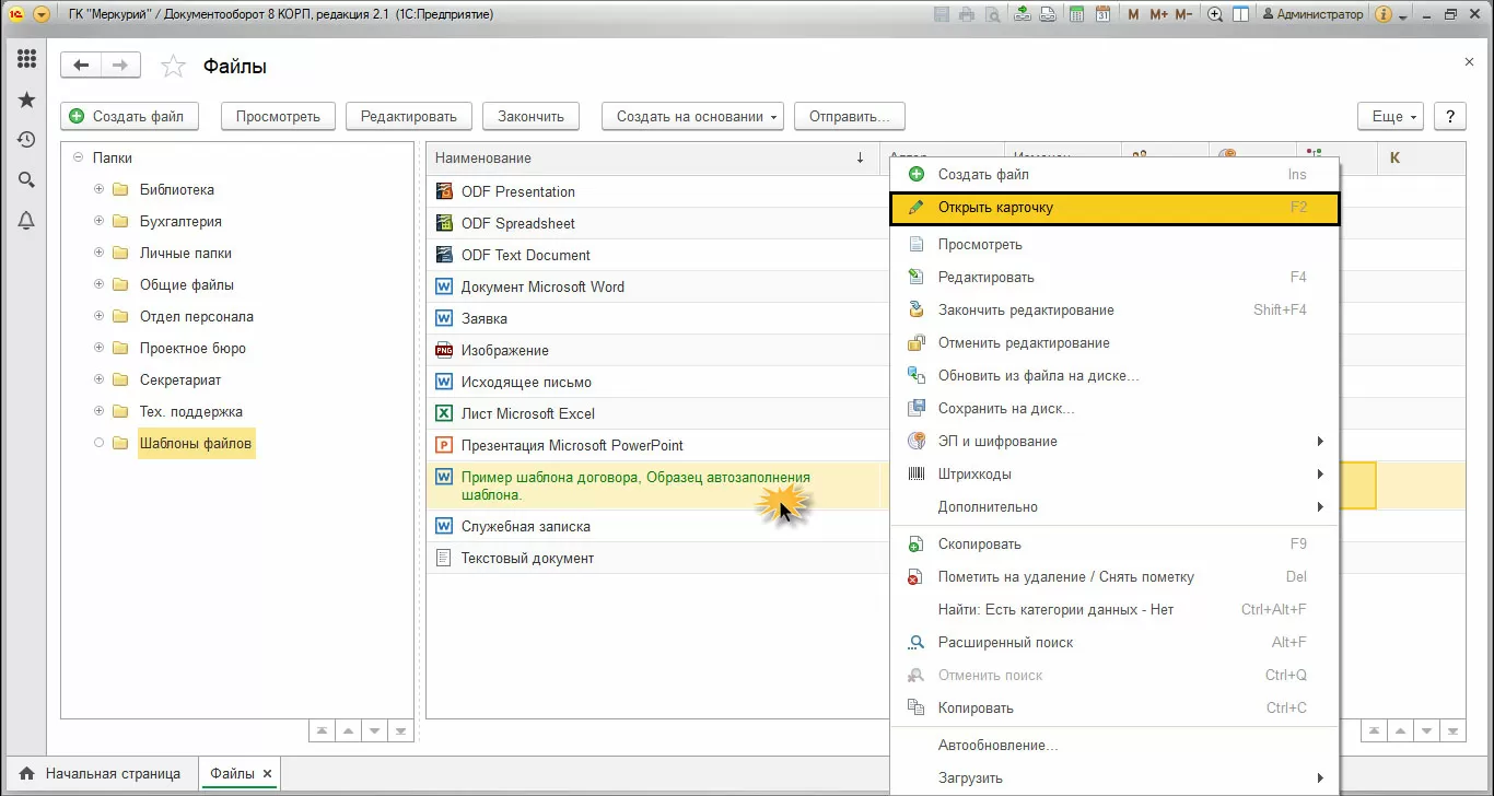Чтобы открыть карточку нашего шаблона, нужно щелкнуть на нем правой кнопкой мышки и выбрать команду «Открыть карточку».