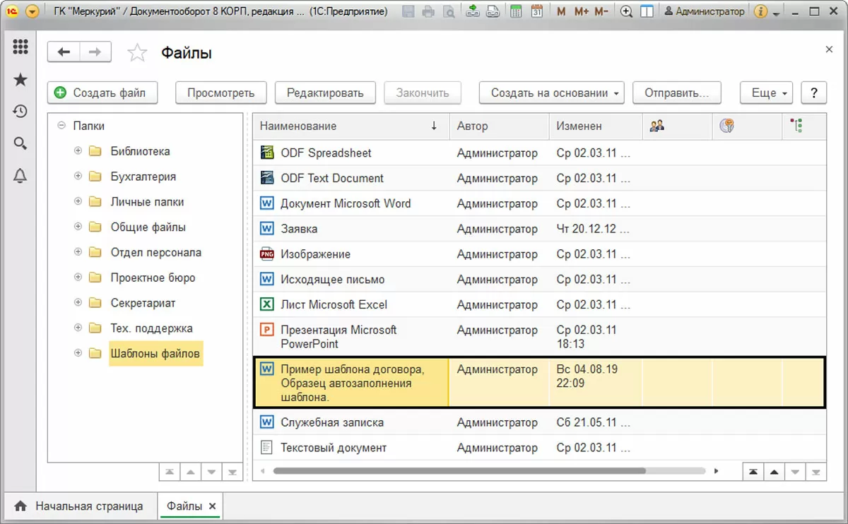 В формируемый пользователем файл документа данные подставляются автоматически из настроенной карточки документа. Помимо этого, работа с шаблонами позволяет ускорить согласование таких документов по сокращенной схеме обработки.