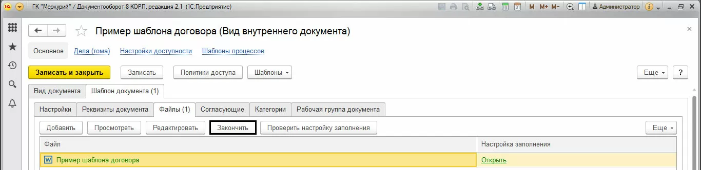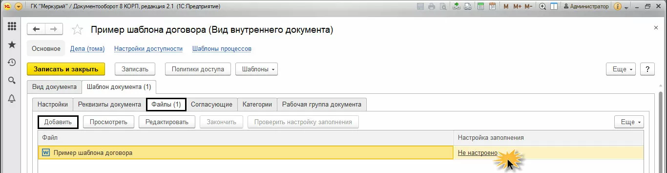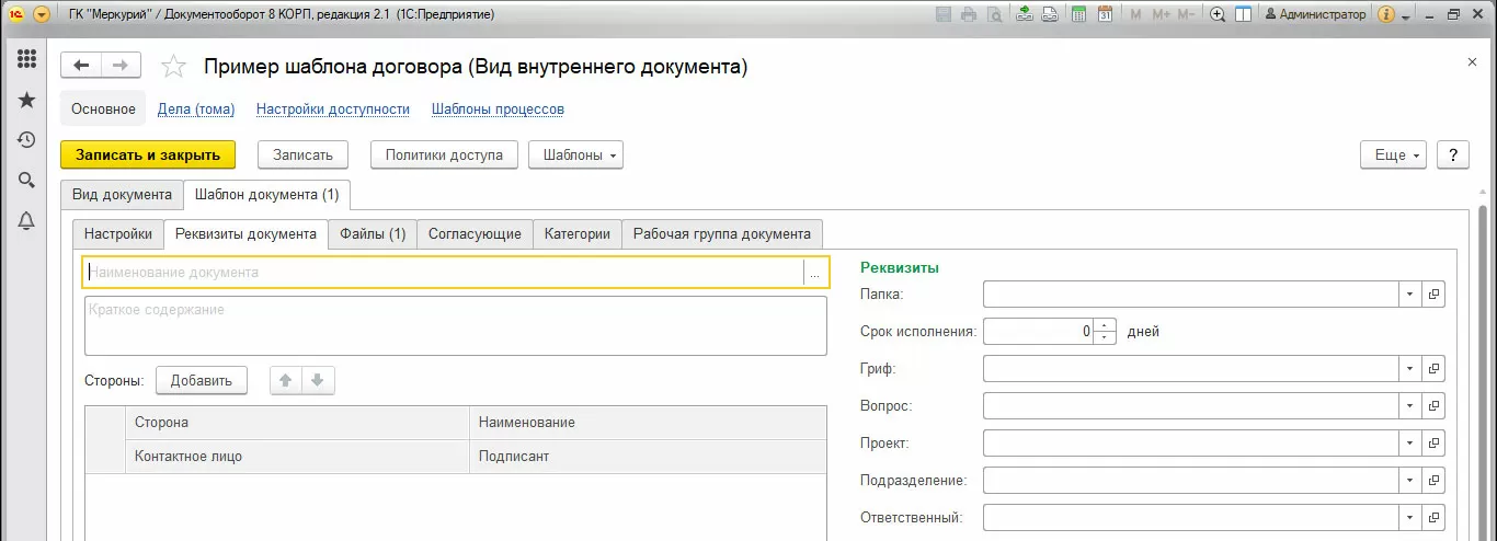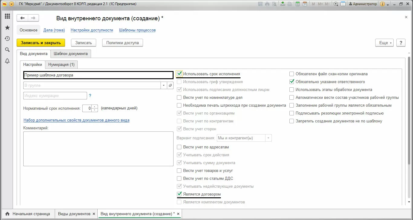 Назовем его «Пример шаблона договора» и в настройках установим галочки «Использовать срок исполнения», «Является договором». При необходимости документ можно включить в какую-либо группу, задать индекс нумератора (префикс или суффикс документа) и установить другие настройки. Если каких-либо реквизитов не хватает, их можно задать, перейдя по гиперссылке «Набор дополнительных свойств документов данного вида».