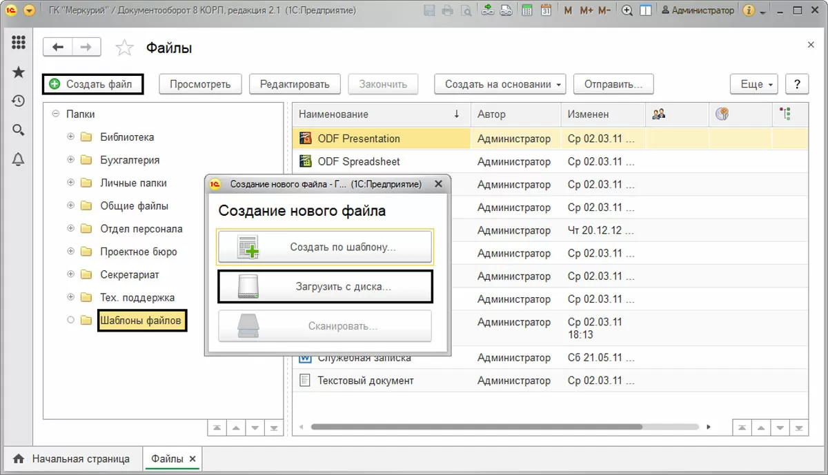 В открывшемся окне, выделив папку «Шаблоны файлов», загрузим нашу новую заготовку для шаблона по кнопке «Создать файл». В диалоговом окне выберем команду «Загрузить с диска».