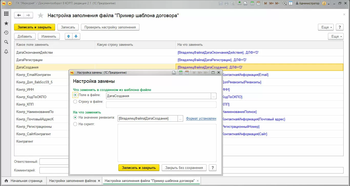 Для каждого поля следует ввести параметры замены. Реквизит, на который надо заменить, может быть задан в виде выражения на встроенном языке или в виде скрипта (последовательных действий, написанных на скриптовом языке для автоматического выполнения задачи).