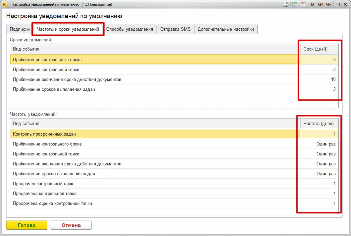 В верхнем окне можно настроить количество дней до наступления события, с которого система начнет уведомлять пользователей. В нижнем окне настраивается периодичность этих уведомлений – единожды или с заданной частотой.