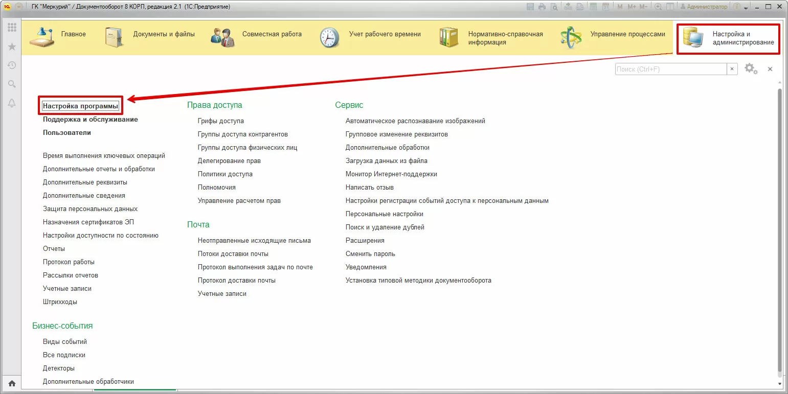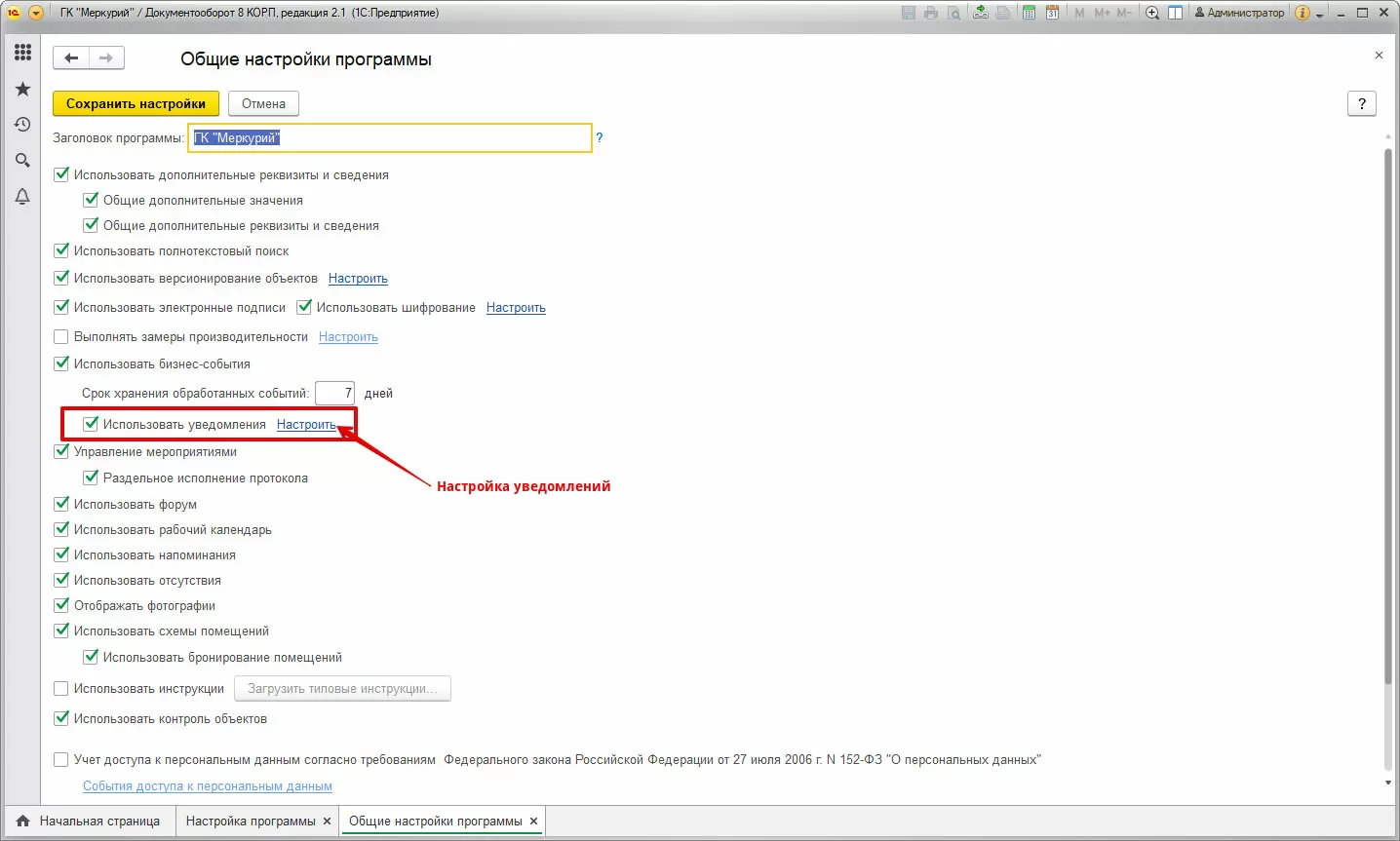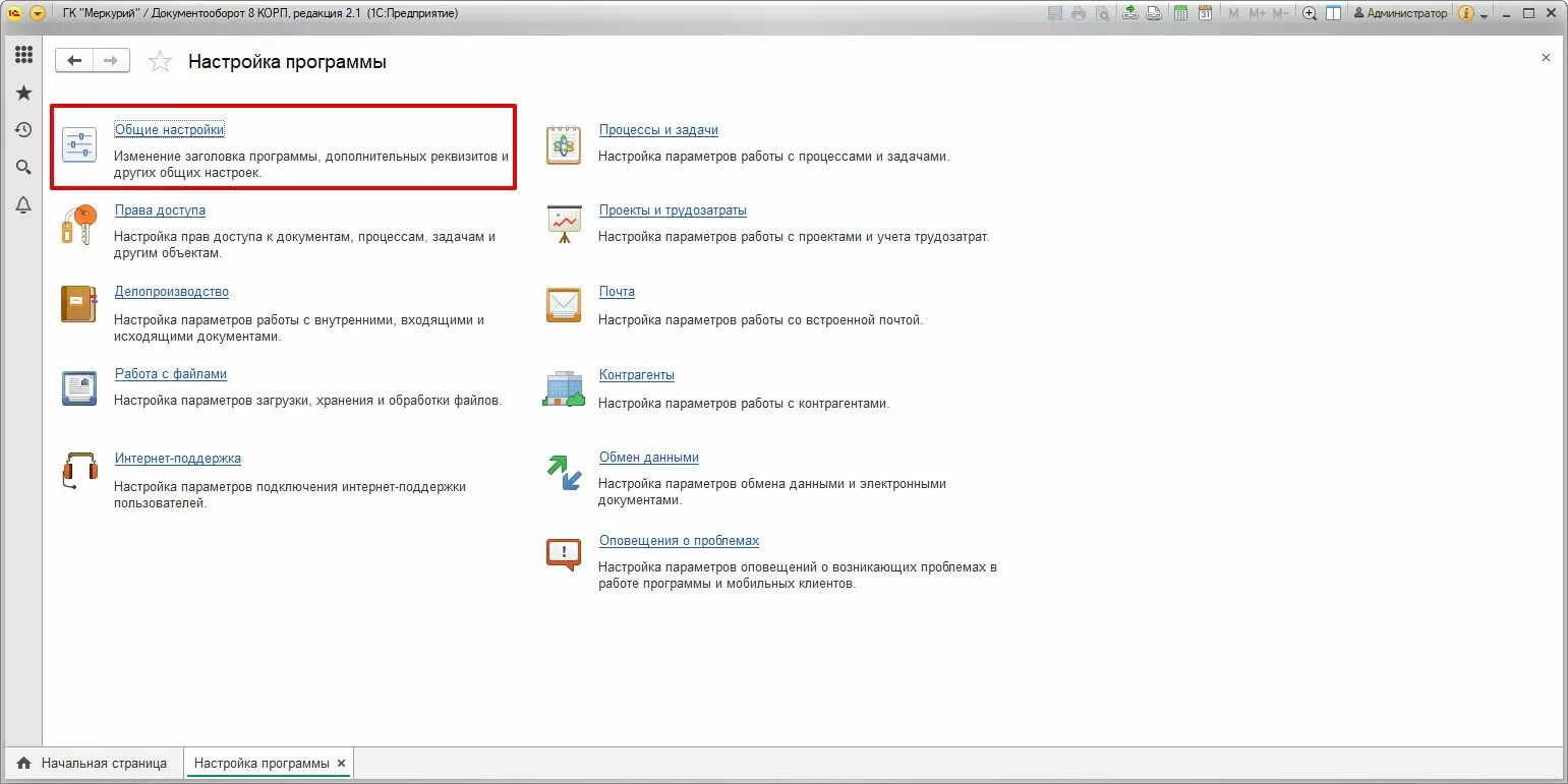 Чтобы произвести начальные настройки уведомлений в системе, администратору необходимо в разделе «Настройка и администрирование» перейти в меню «Настройки программы-Общие настройки программы».