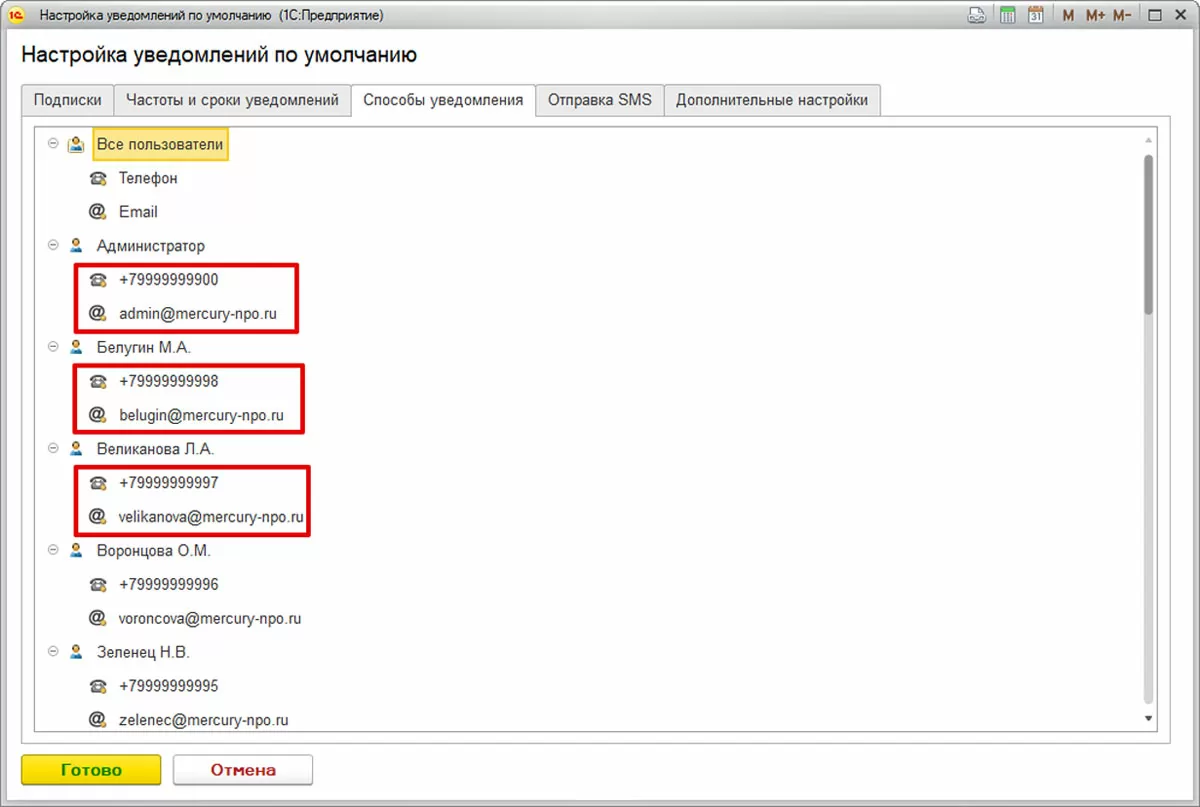 Способы уведомлений для каждого из пользователей настраиваются в соответствующем окне, причем ссылки на контакты интерактивны, по ним сразу же можно перейти в карточку пользователя для внесения или изменения контактной информации.