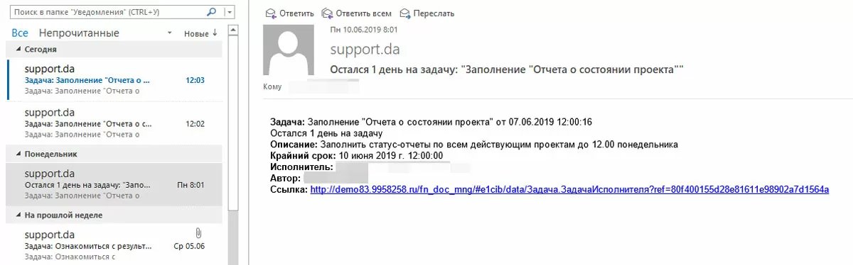 Из письма сразу можно перейти к предмету уведомления – в данном случае откроется окно задачи в веб-браузере.