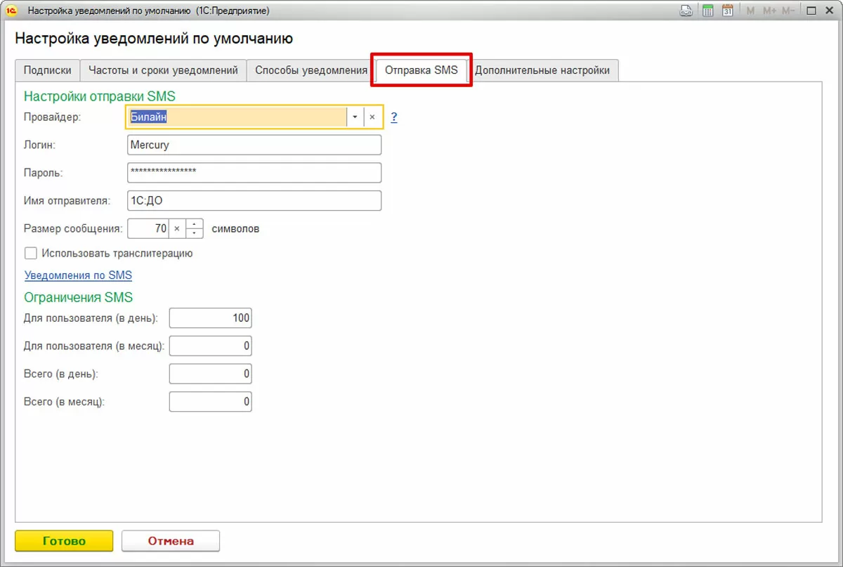 На следующей вкладке «Отправка СМС» указываются настройки взаимодействия с СМС-провайдером.