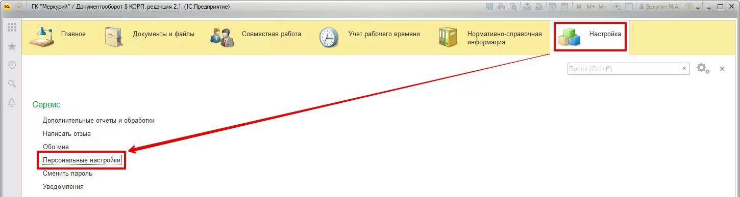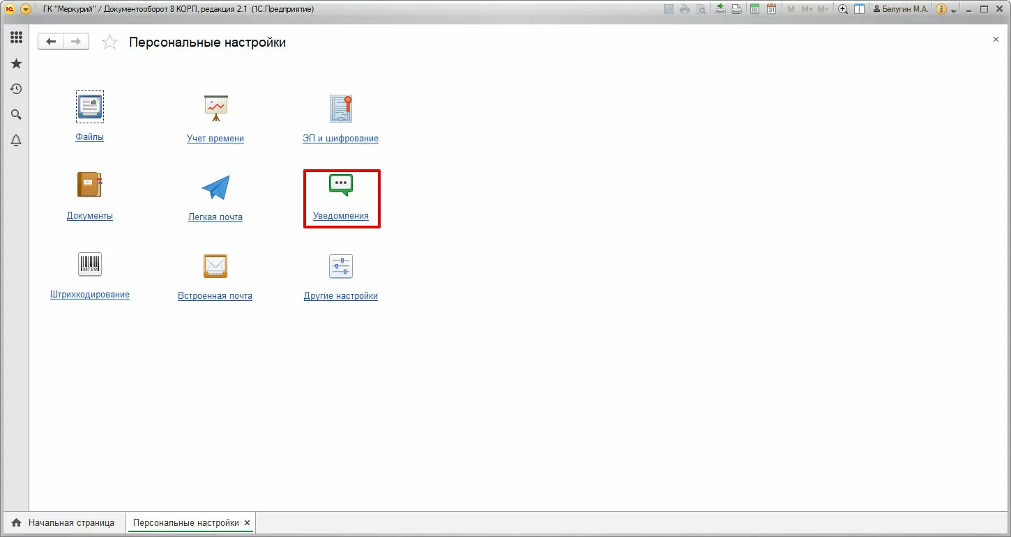 Если администратор разрешил изменять настройки уведомлений по умолчанию пользователям, для того чтобы внести какие-то индивидуальные изменения в эти настройки, необходимо в разделе «Настройки» перейти в меню «Персональные настройки».