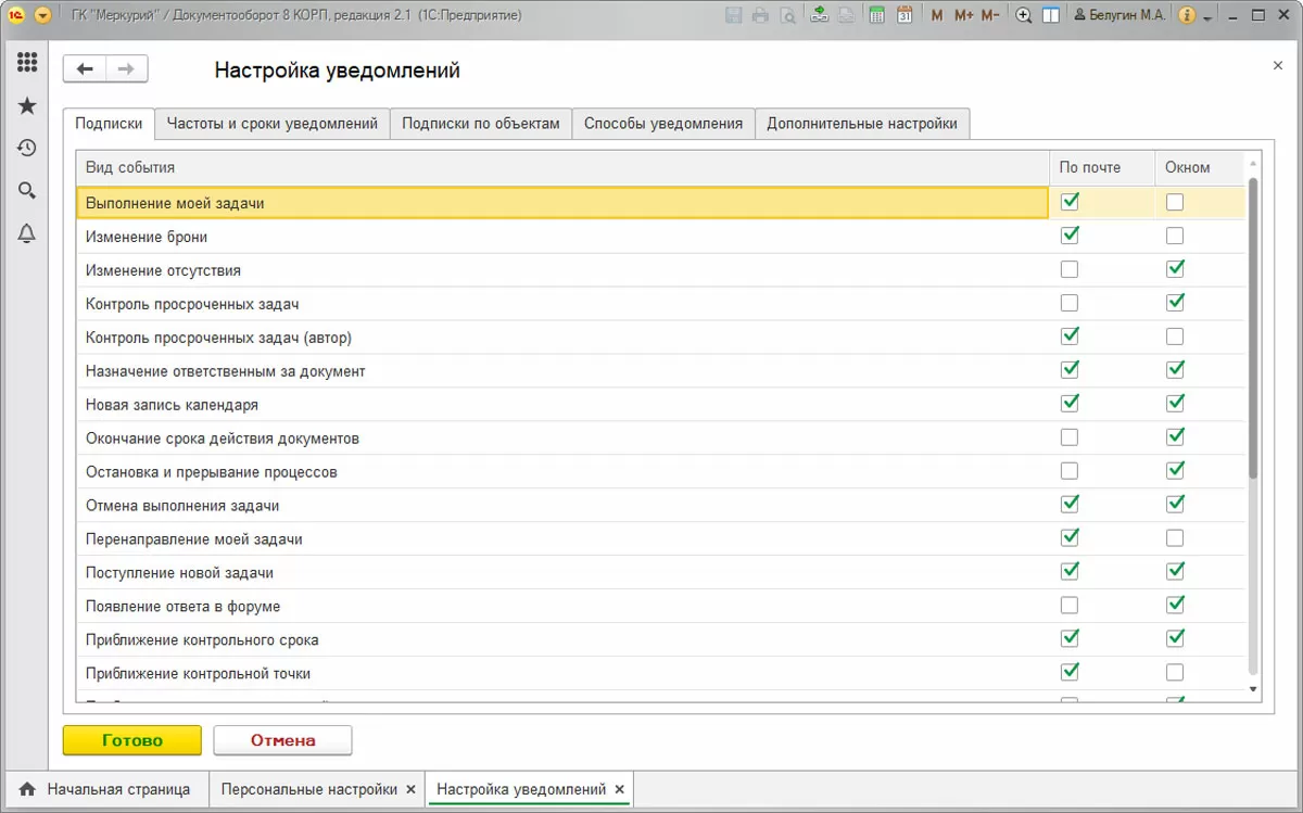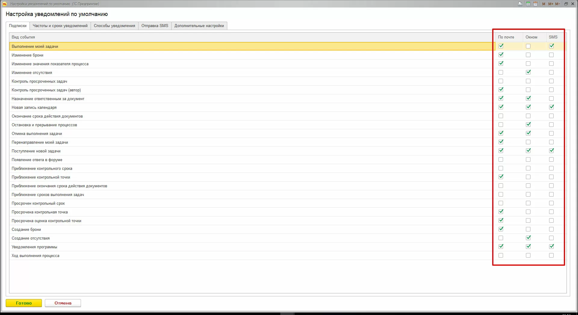 На первой вкладке рабочего места настроек уведомлений по умолчанию настраиваются виды событий, по которым требуется уведомления тем или иным способом. Способов отправки в системе существует три: отправка уведомлений на почту электронным письмом, всплывающим окном и СМС-сообщением.