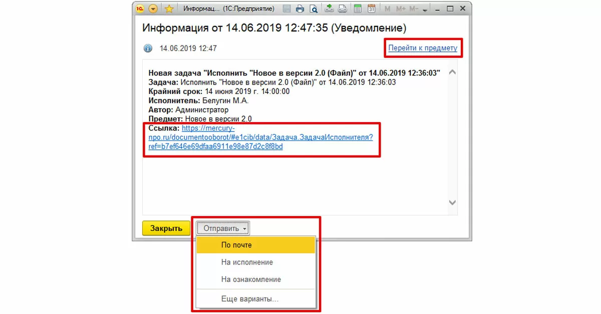 Во всплывающем окне тоже есть возможность перейти к предмету уведомления – задаче. Открыть задачу в веб-браузере или создать на основании подзадачи другим пользователям.