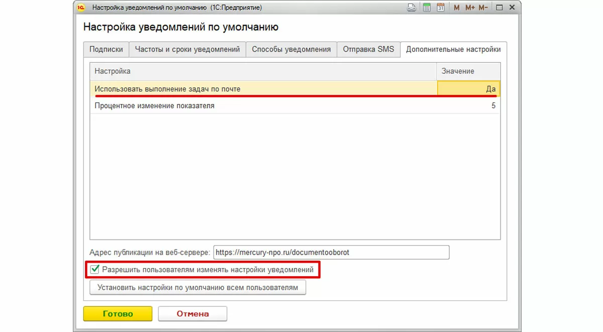 Тут же указывается адрес публикации СЭД на веб-сервере, устанавливается разрешение пользователям изменять настройки уведомлений индивидуально для себя, а также есть возможность выставленные настройки по умолчанию установить сразу всем пользователям системы, сбросив их индивидуальные изменения уведомлений.