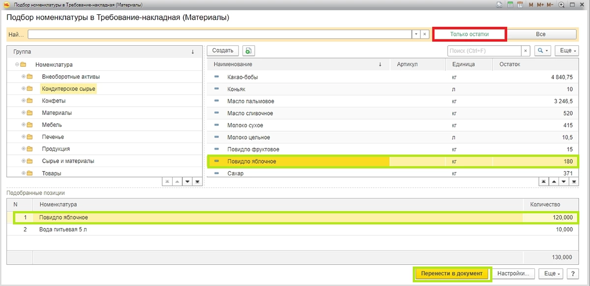 Ниже показан экран формы при нажатии кнопки «Подбор». Для удобства работы, чтобы видеть только те позиции, по которые есть фактические остатки, следите, чтобы кнопка «Только остатки» была нажата. Выбираем все необходимые позиции, и по щелчку мыши они попадают в раздел «Подобранные позиции». Затем следует нажать кнопку «Перенести в документ».