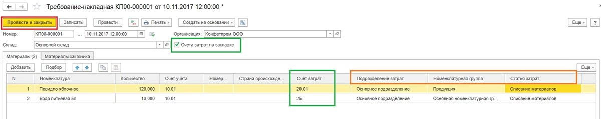 Все выбранные позиции отобразятся в табличной части нашего документа на списание материалов. Обратите внимание, включен параметр «Счета затрат на закладке «Материалы»», и из выбранных позиций «Повидло яблочное» списано на 20-й счет, а «Вода питьевая» – на 25-й.
