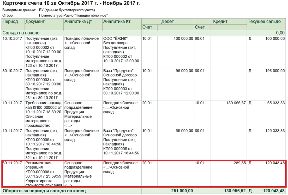 Алгоритм расчета средней цены, на примере позиции «Повидло яблочное». До списания было два поступления этого материала: