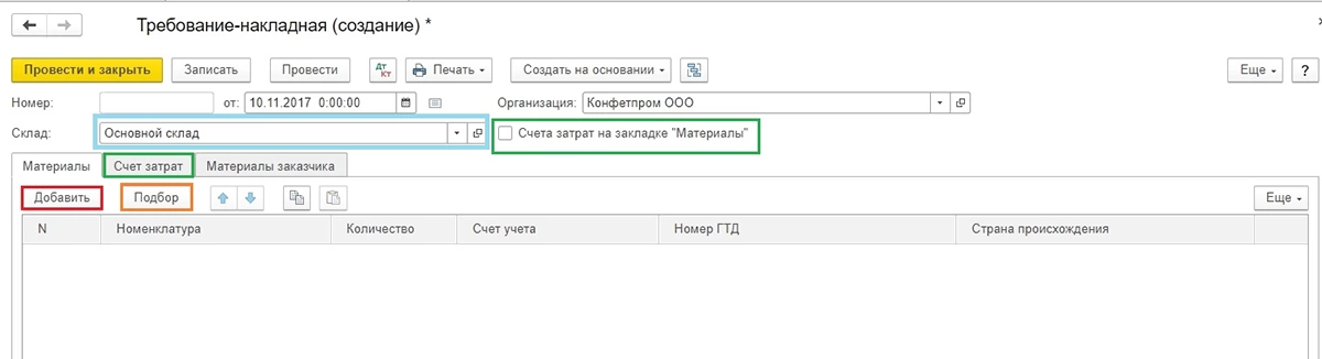 Создаем новый документ. В шапке документа выбираем Склад, с которого будем списывать материалы. Кнопка «Добавить» в документе создает записи в табличной его части. Для удобства выбора можно воспользоваться кнопкой «Подбор», которая позволяет увидеть остатки материалов в количественном выражении. Кроме того, обратите внимание на связанные между собой параметры – вкладка «Счета затрат» и настройка-галочка «Счета затрат на закладке «Материалы»».