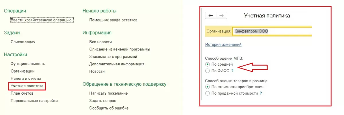 В настройках отыщем подменю «Учетная политика», и в нем – «Способ оценки МПЗ».