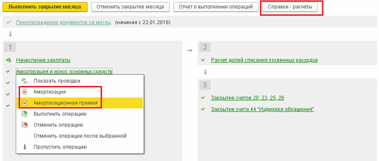 Найти справку из «Закрытия месяца» можно, перейдя в раздел «Операции–Закрытие месяца». Бухгалтерская справка-расчет будет доступна только при успешном завершении регламентной операции, и об этом будет свидетельствовать зеленая галка рядом с соответствующей операцией.