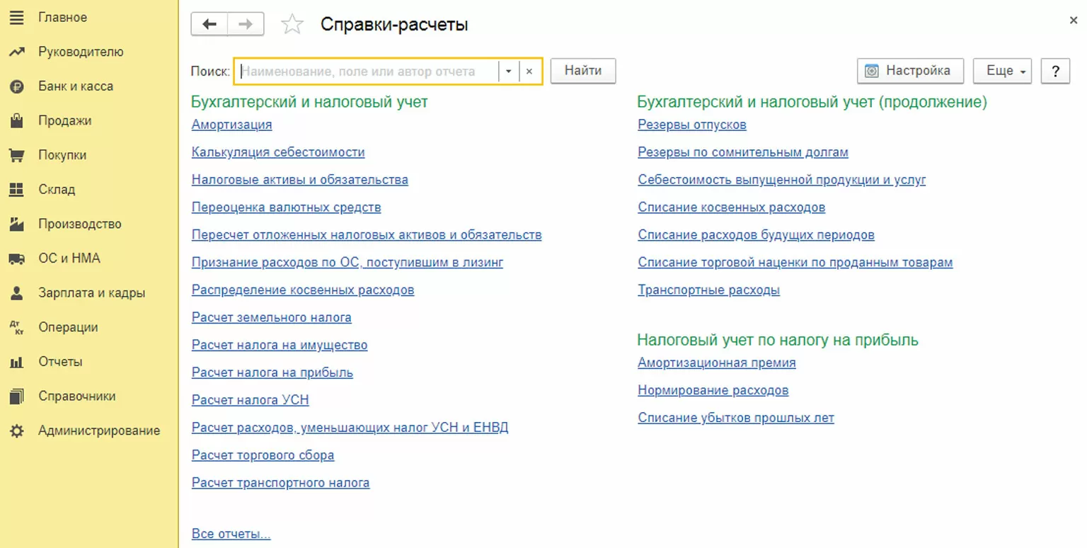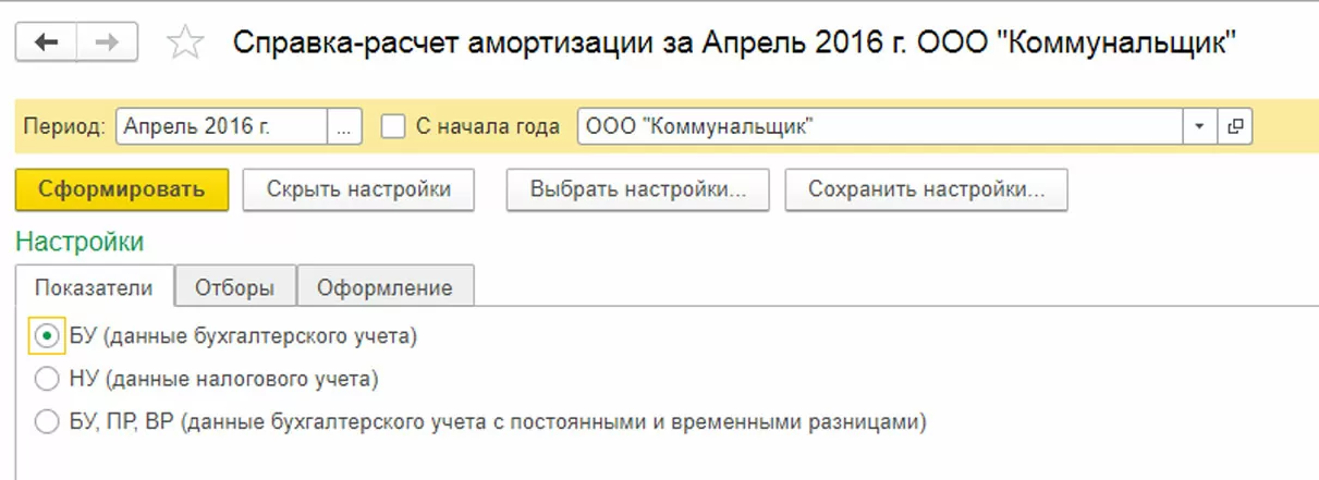 Так как бухгалтерские справки-расчеты представлены отчетами, то существует возможность гибкой настройки показателей отчетов: здесь можно установить необходимые отборы. Например, для справки по расчету амортизации можно указать, по данным какого учета выводить отчет. Автоматом справка формируется по бухучету.