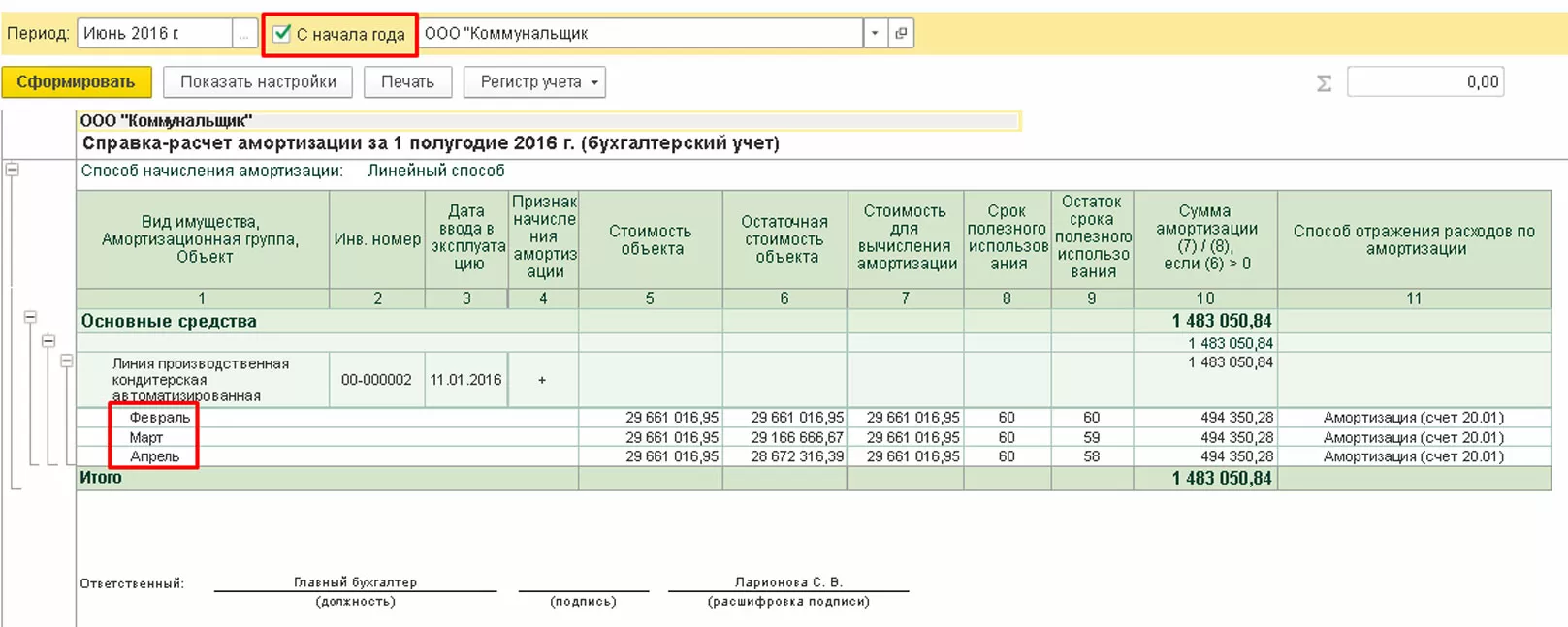 Расчет амортизации через регламентную операцию производится каждый месяц. После расчета можно открыть и распечатать соответствующую справку.