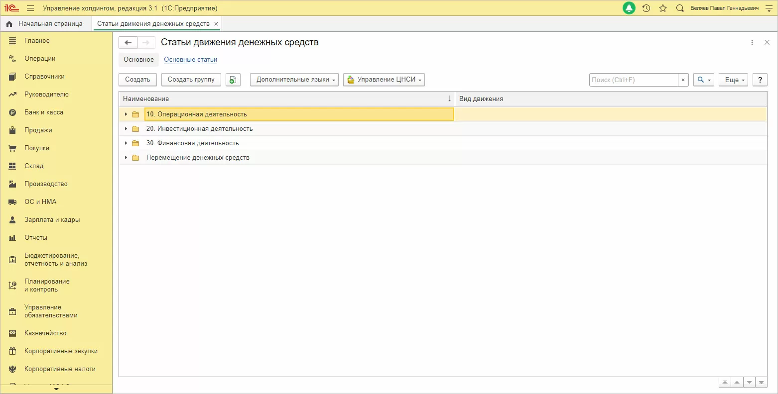 - Для группировки верхнего уровня достаточно четырех перечисленных выше групп статей – «Операционная деятельность», «Инвестиционная деятельность», «Финансовая деятельность», «Перемещение денежных средств».