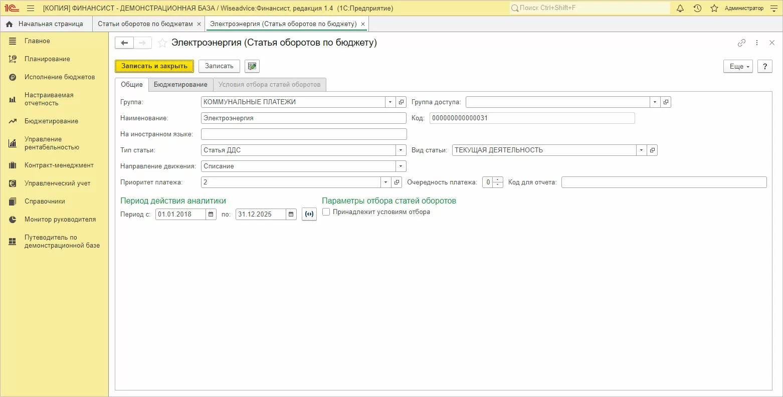 - «Тип статьи» – статья ДДС, статья бюджетирования;