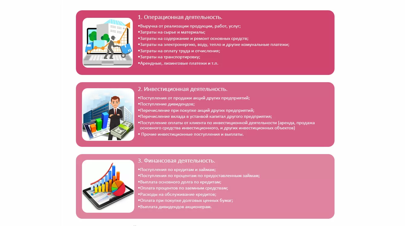 - Финансовая деятельность включает такие статьи по операциям с финансами, как выплата дивидендов, поступления по кредитам и займам, выплата кредитов, расходы по обслуживанию и т.п.