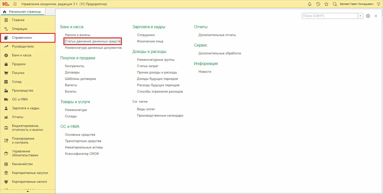 В 1С:Управление холдингом перечень «Статьи движения денежных средств» расположен в разделе «Справочники».
