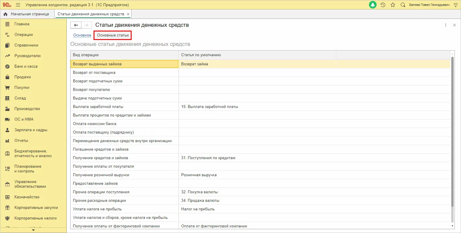 По гиперссылке «Основные статьи» видно, для какого вида операции какая статья ДДС закреплена по умолчанию.