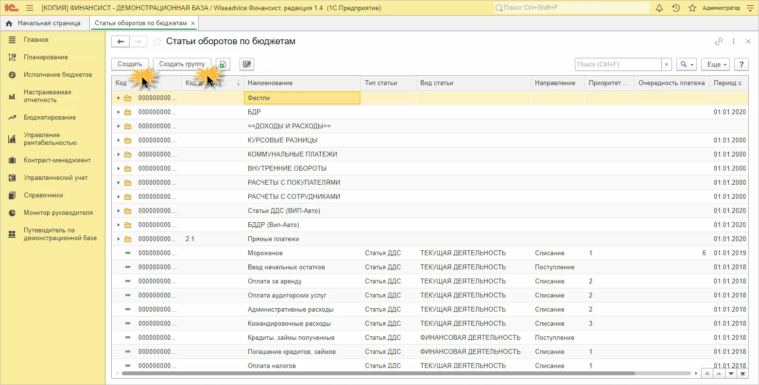 Открыв его из любого раздела, пользователь может попасть в справочник, создать группы и наполнить их своими статьями ДДС по кнопкам «Создать группу» и «Создать».