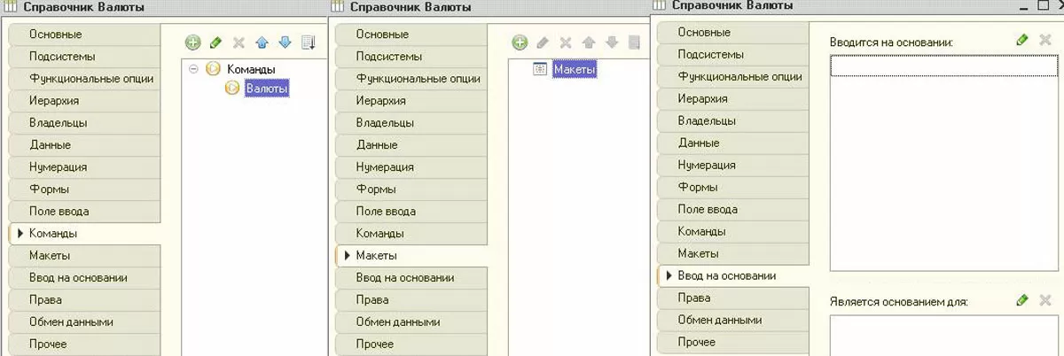 Раздел «Команды» показывает перечень существующих кнопок, вызывающих данный справочник. В «Макетах» вы сможете найти все печатные формы конкретного объекта конфигурации. «Ввод на основании» будет затронут разработчиком в тех случаях, когда на основании элемента справочника планируется создавать другие объекты конфигурации.
